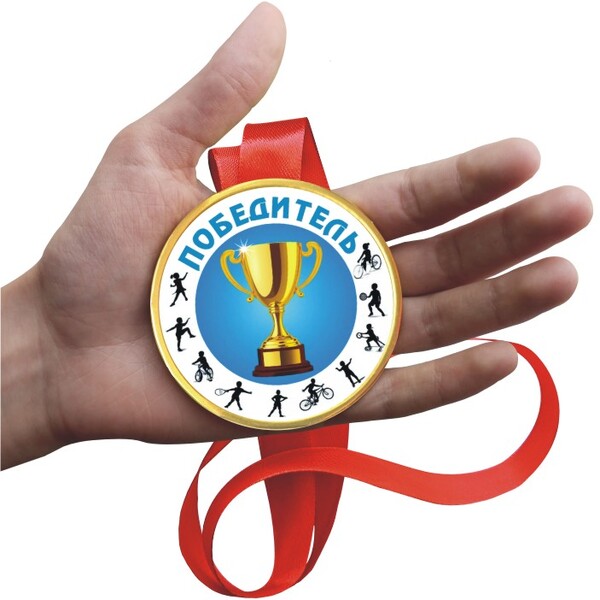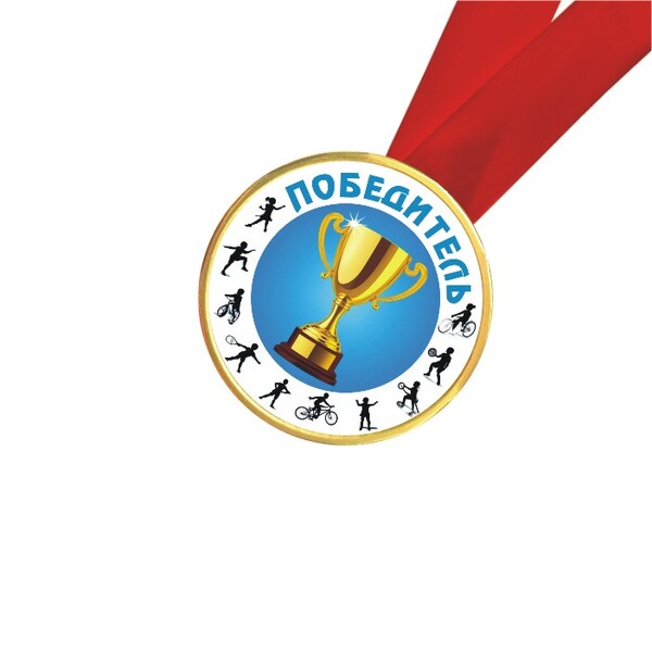 Шоколадная медаль на ленте Победитель (наклейка, лента синяя)