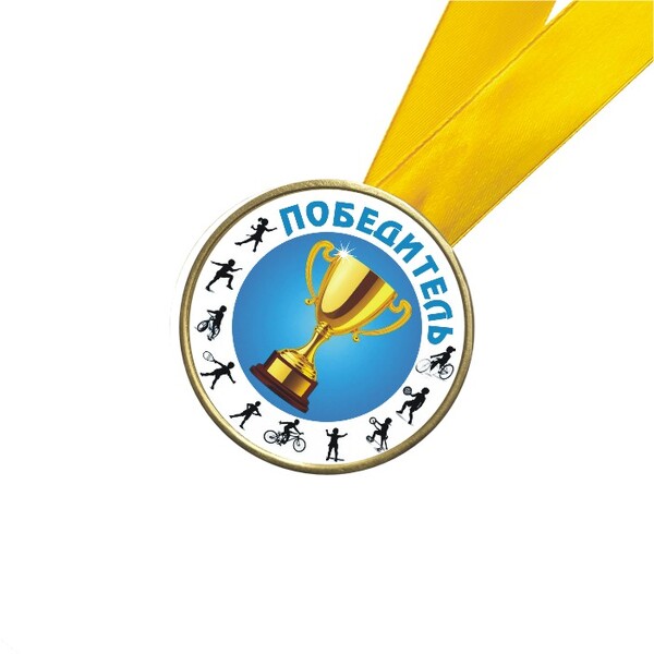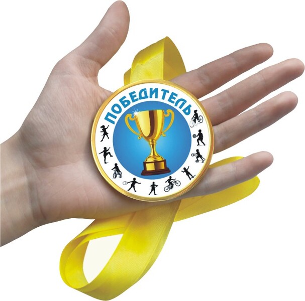 Шоколадная медаль на ленте Победитель (наклейка, лента синяя)